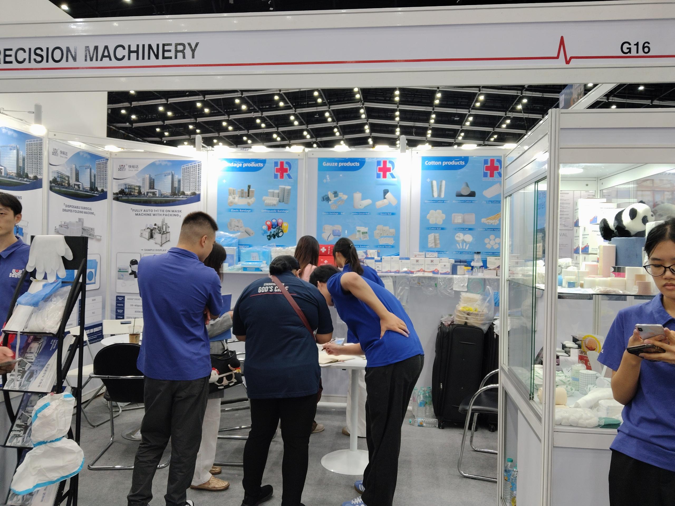 Fuar alanında HAORUN MEDİKAL'in G16 standı oldukça dikkat çekici. Tesis içi fotoğraflardan da görülebileceği gibi, çevresinde bandaj, pamuklu çubuk gibi çeşitli tıbbi malzemeleri kapsayan çeşitli tıbbi ürünlerin tanıtım posterleri bulunmaktadır. Mavi üniformalı personel, danışmaya gelen profesyonel izleyicilerle iletişim kurmakla meşgul. Bazıları ürünlerin özelliklerini ve avantajlarını dikkatle kitleye tanıtıyor, bazıları ise müşterilerin ihtiyaçlarını ve geri bildirimlerini dikkatle kaydediyor. Tesis bünyesindeki atmosfer sıcak ve profesyoneldir.